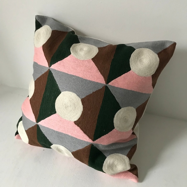手刺繍で一つずつ丁寧に作られるクッションカバー。 白丸にピンクにグレー、ブラウン、グリーンを配してます。 表面はサラリとした上質のウールを使用、裏は生成りのコットンキャンバスになります。 インドの工房からの直輸入になります。カバーのみの価格になります。 size 45x45cm (やや大きめ) 表wool 100% 裏コットン100% ファスナー付