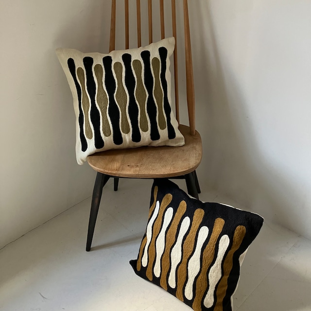 手刺繍で一つずつ丁寧に作られるクッションカバー。 プリミティブモダンな柄がインテリアで良いアクセントになる人気のクッションです。 表面はサラリとした上質のウールを使用、裏は生成りのコットンキャンバスになります。 インドの工房からの直輸入になります。カバーのみの価格になります。 size 45x45cm (やや大きめ) 表wool 100% 裏コットン100% ファスナー付