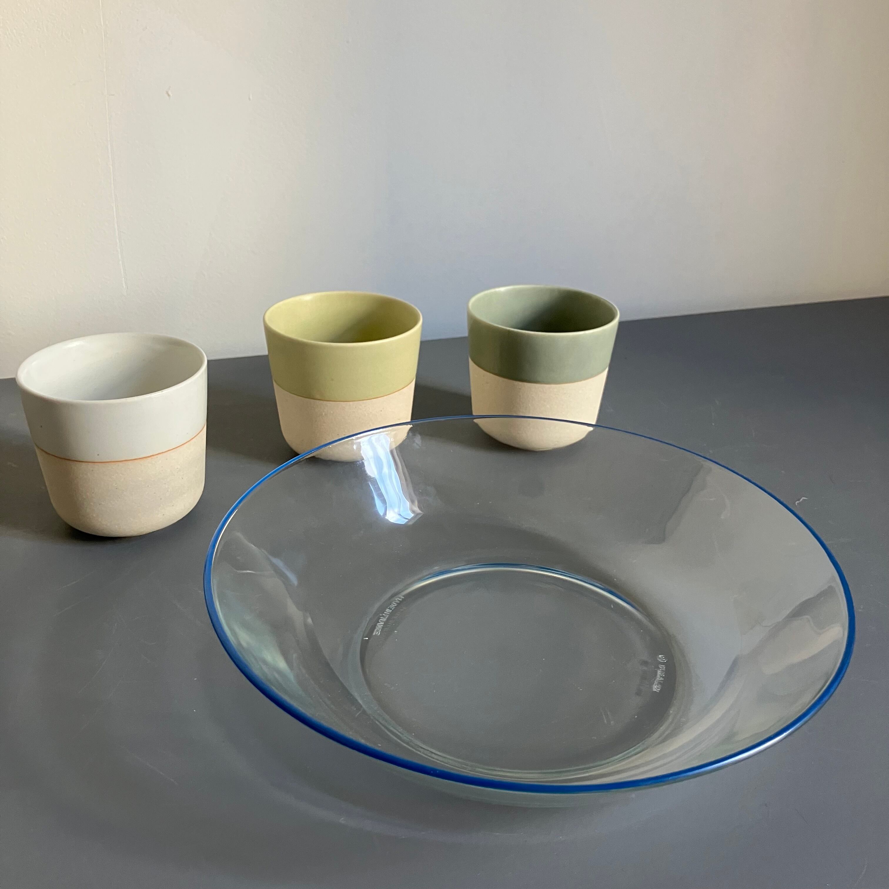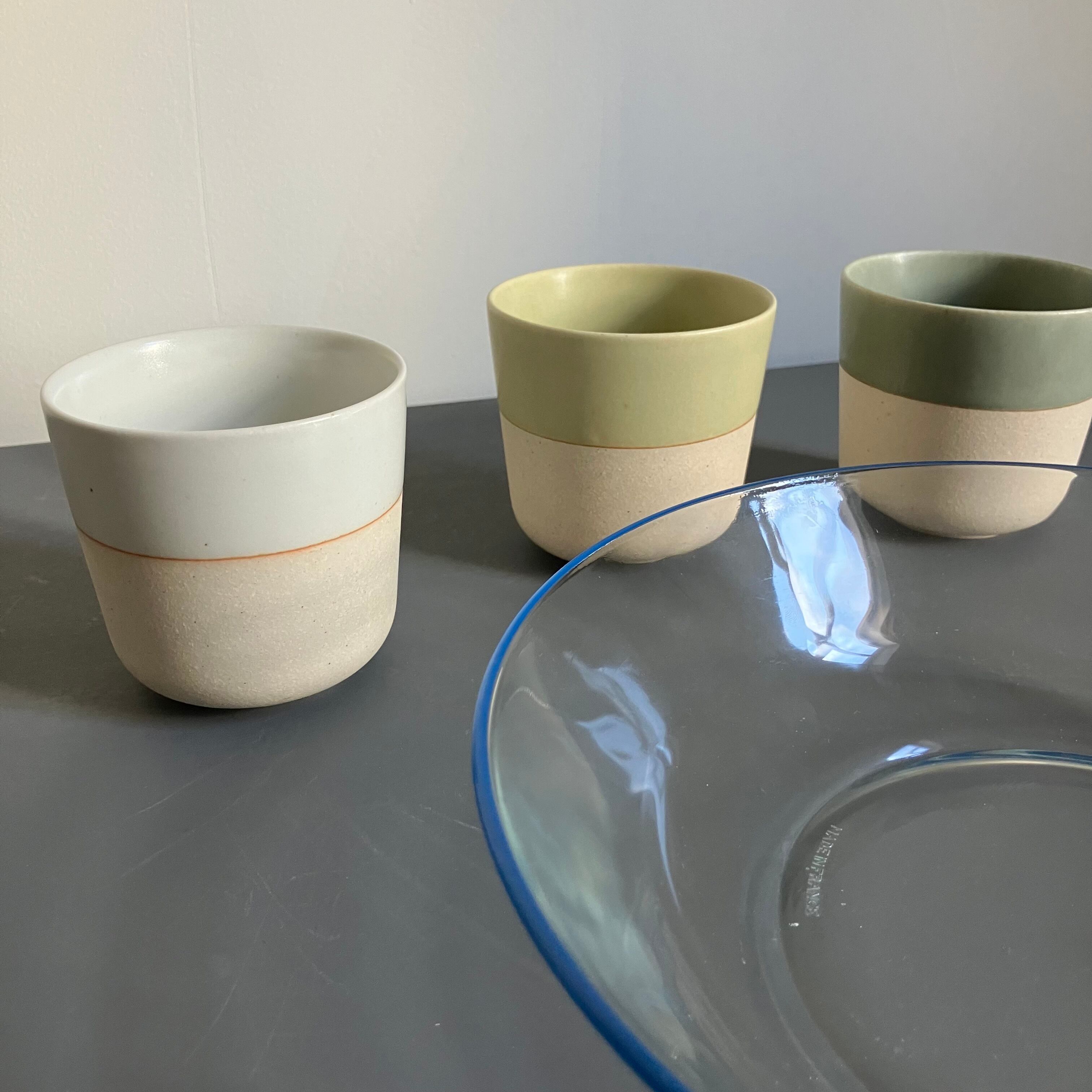 blue lineが爽やかな深さのあるガラスプレートと、釉薬の色味が素敵なティーカップ。