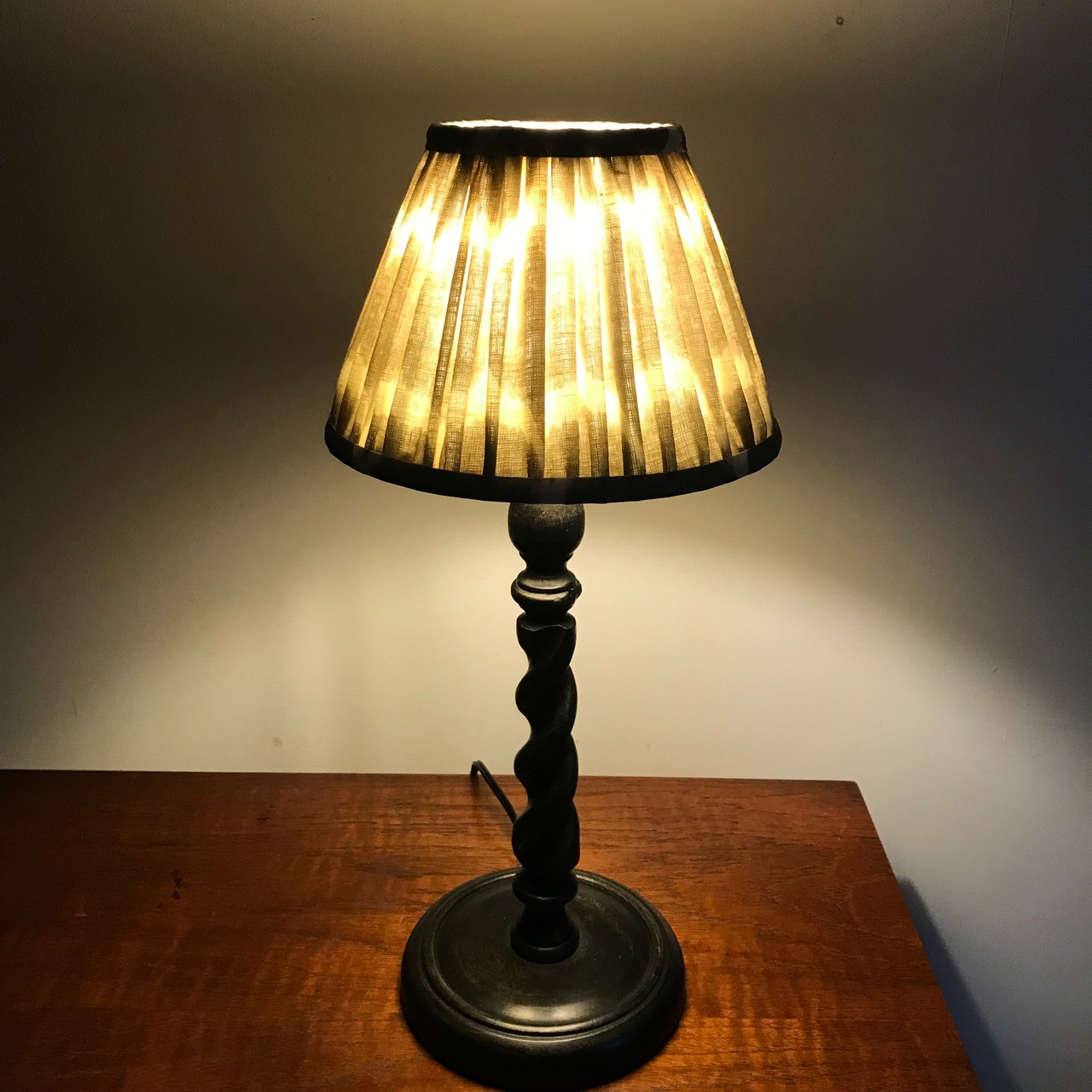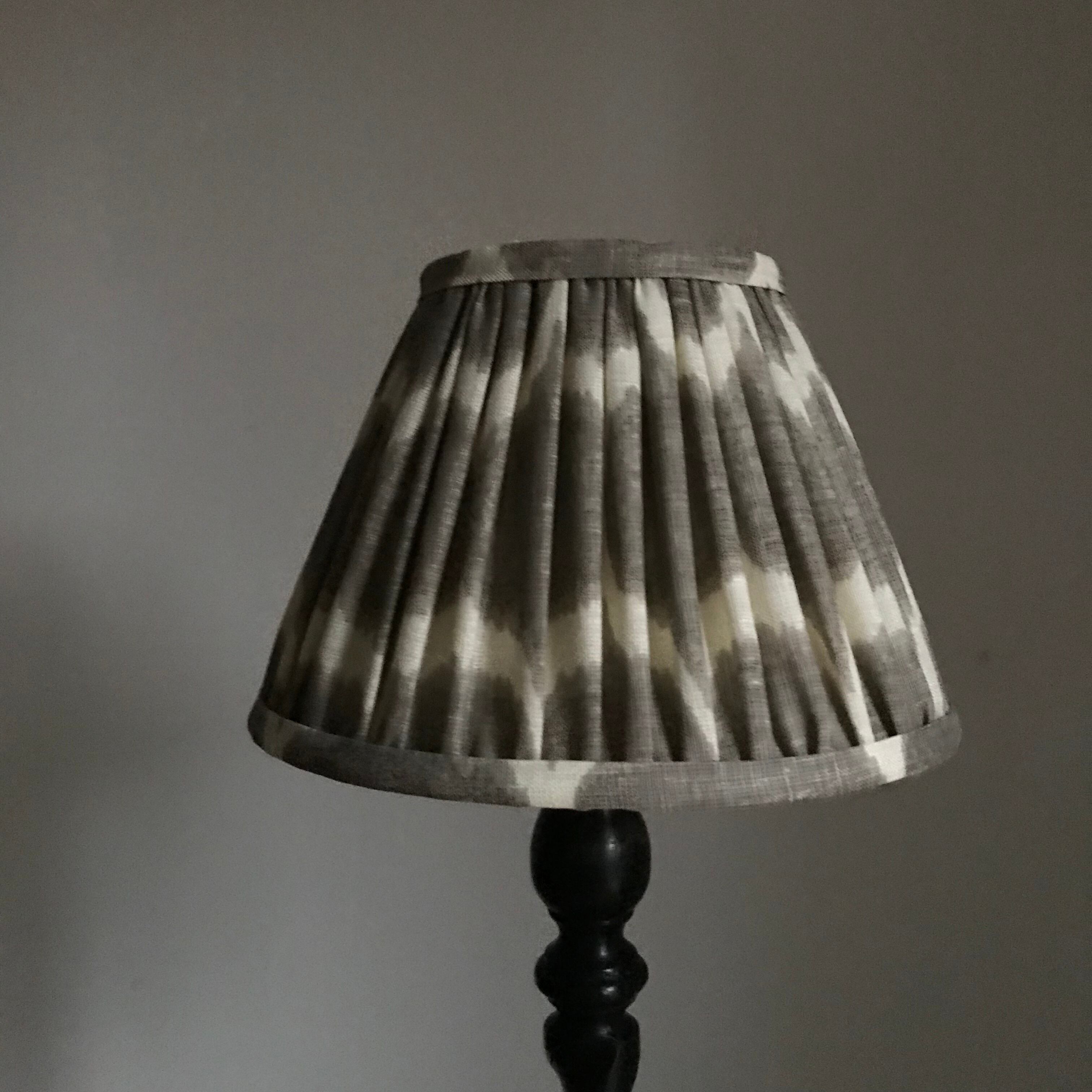 グレーイカットのリネンシェードにツイストシェープのダークマホガニーベースを合わせた